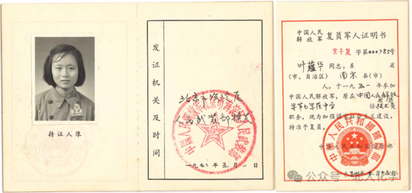 “当时我才十四五岁,不可能上前线,就被分配到华东军区卫生部下属的一个药训班学习,药训班于1952年底编入第七军医中学,1953年3月结业。大部分学员都分配到部队医院的药房工作,我和少数几个学员则留在苏州的第七军医中学工作。同年4月至8月领导派我到上海第二军医大学药学系生药科进修,回校后任生药科技术员。1953年朝鲜战争结束,1954年部队大规模整编,大多数女兵都要复员。因为我的学习和工作成绩比较突出,在校期间曾立过一次二等功、一次三等功,学校李政委和谢校长找我谈话,他们希望送我到上海第二军医大学深造。因受‘学好数理化,走遍天下都不怕’的影响,我希望学理科,经与父母商量后,决定复员,上中学然后参加高考。在部队三年多,培养了我吃苦耐劳和集体主义精神及克服困难的勇气和毅力,这对我后来的人生有很大的影响。”