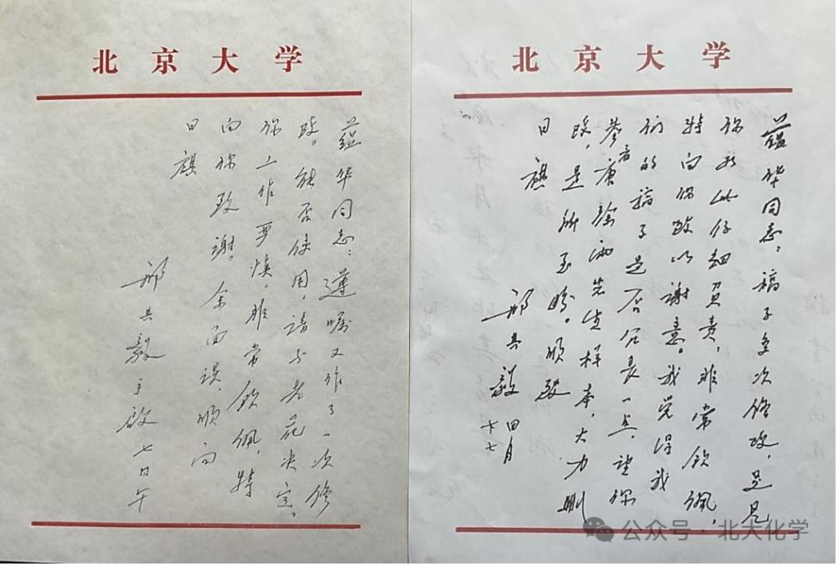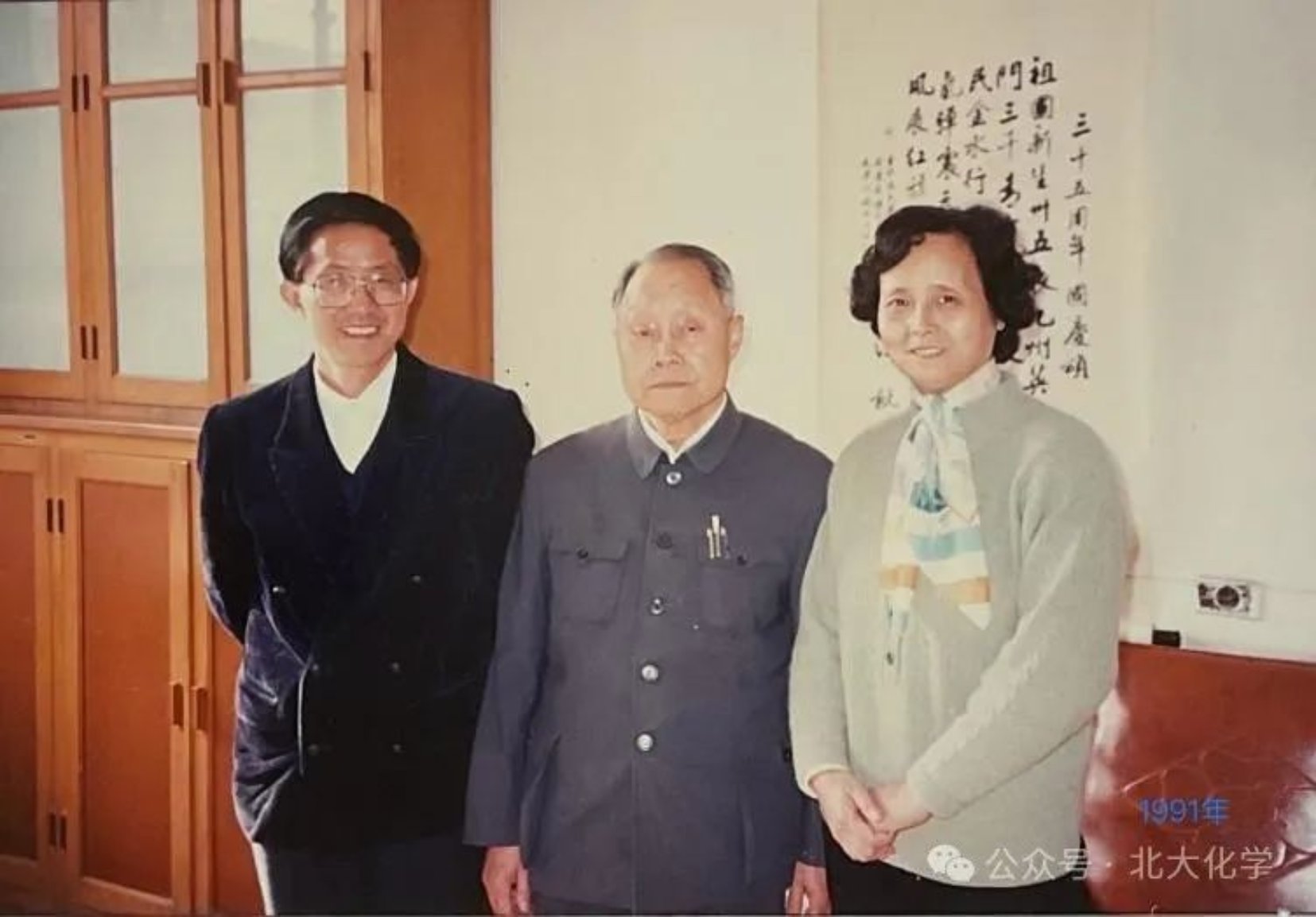 “在北京大学有各研究领域的专家,有不懂的问题,可以随时去请教。1978年,我在高分子教研室时,蒋硕健老师要我给大家介绍一下福井谦一的‘前线轨道理论’与伍德沃德-霍夫曼的‘分子轨道对称守恒原理’,因为这是60年代理论有机化学与量子化学的一项重大成果。我在读有关文献时,遇到许多不太懂的涉及量子化学的问题,就去请教徐光宪先生。我没有上过他教的课,和他不是很熟悉。当时我们都住在蔚秀园,我怀着紧张的心情,冒昧地到他家去请教,徐先生不仅热情的接待了我这个年轻的助教,更没想到的是第二天徐先生竟然给我写了一个7页16开纸的答复。徐先生深入浅出的写了福井谦一提出的‘前线轨道理论’中的基本概念,使我能逐步看懂文献中的介绍,经过近三个月的努力,我初步了解了‘前线轨道理论’与‘分子轨道对称守恒原理’的基本内容。后来好几位同事如尚振海、高执棣等同事都借去抄写了徐先生回答的稿纸。徐先生是量子化学大家,他诲人不倦、平易近人、谦和可敬的作风令我非常感动!以后我们和徐先生的来往就比较多了,逢年过节时会去看望他和夫人高小霞院士,他还赠送给我们他与夫人合影的珍贵照片。徐先生是有杰出贡献的科学家,并且花大力气教书育人,非常乐于培养、提携年轻人,是我们永远学习的榜样!”