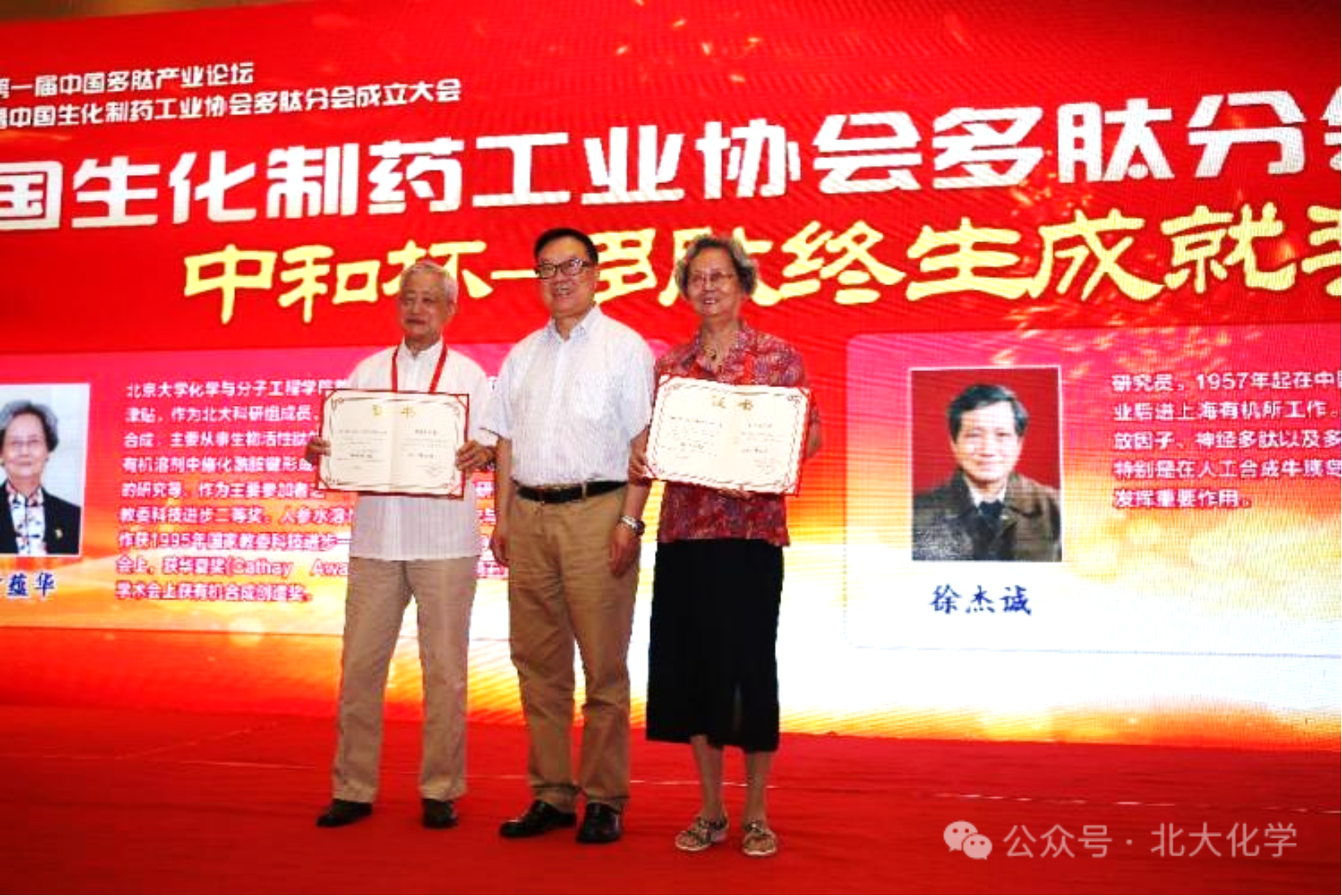 叶老师退休之后发表了28篇学术论文(第一作者或通讯作者)、带了10名博士后,再加上其他学术相关工作,2019年获得北京大学颁发的“离退休教职工学术贡献奖”一等奖。2019年8月应中国生物工业制药协会邀请,参加了在合肥举行的多肽分会成立大会。会上叶老师与中科院上海有机所徐杰诚教授两人被授予中和杯多肽终生成就奖。