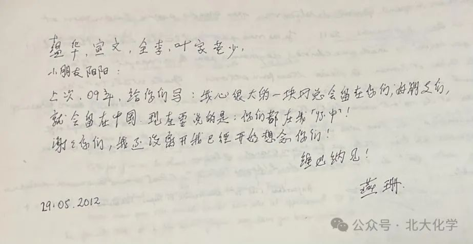 “我们辅导过的好朋友戈泰与燕珊都在我们家住过。燕珊原在奥中友协工作,几乎每年都来北京住北京饭店,她退休后再来看望老朋友常住我家或陈根茹家。下面是她两次离京头一天晚上的留言。2009年6月6日,她写道‘蕴华,宣文老友,每次能跟你们一起我就非常高兴,感动--谢谢你们一切!我不得不离开你们,离开中国,可是我心很大的一块总会留在你们这。多多保重!拥抱你们的燕珊。’2012年是她最后一次访问北京,住在我们家。5月29日,离京前的晚上留言‘蕴华,宣文,全李叶家老少,小朋友阳阳,上次,09年,给你们写,我心很大的一块总会留在你们,好朋友们,就会留在中国。现在要说的是,你们都在我‘怀中’!谢谢你们,我还没离开我已经开始想念你们!维也纳见!燕珊’。她留言中的小朋友阳阳是我们4岁的孙子。燕珊的留言反映了她是多么的热爱中国。由于她不用电脑和微信,我们每年要互通几次电话,互致问候。”