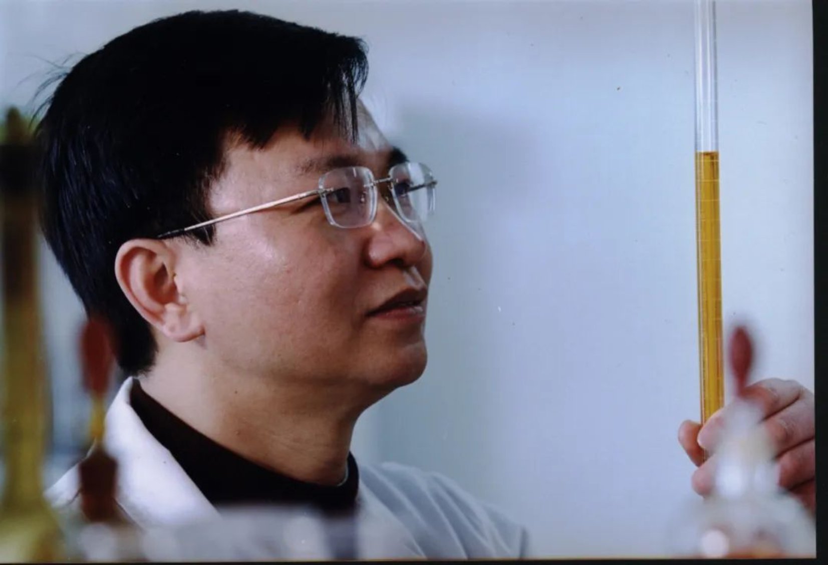 “在当时实验条件下,这个工作其实有相当大的难度。我们那会儿没有微体积计量的仪器,我就动脑筋想了一个办法,请玻璃工师傅用一毫升的移液管改装了一个,可以准确测出0.01毫升的体积。然后就是如何测量微乳的含水量。跟导师讨论后认为可以试试‘卡尔·费歇尔滴定法’,这个实验我们没做过,也不知道适不适用于我们的实验环境。不过总的来说很顺利,我通过实验滴定和体积测量,给红外光谱测量结果进行了标定,这样以后用光谱仪就可以直接读出这个萃取过程中的含水量了。”