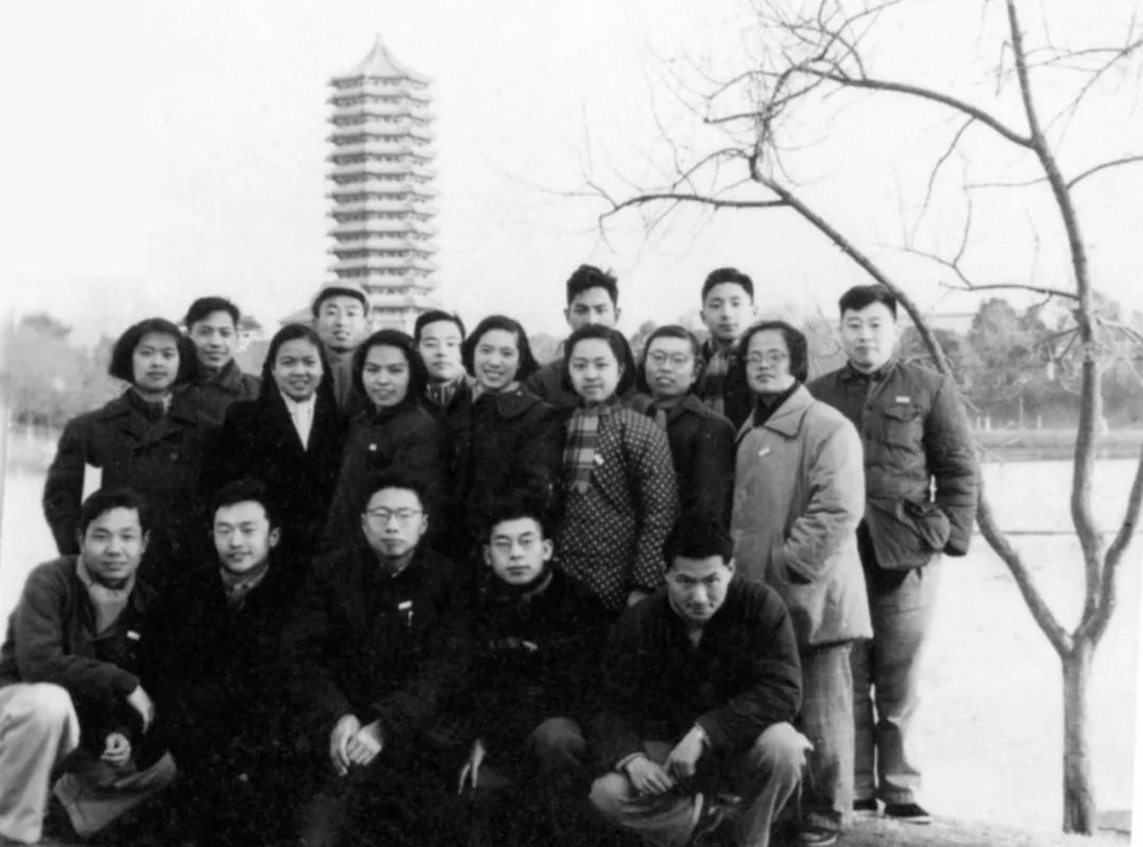 第1排 张嘉郁(左1)、施福荣 (左3)、倪振德 (右1),第2排 梁兆熙 (左2), 第3排 李福绵(左1)、丘坤元 (左2)、王秀岗 (右3)、张鸿志 (右2) 、杨靖先 (右1)。他们是首批高分子专门化本科生。