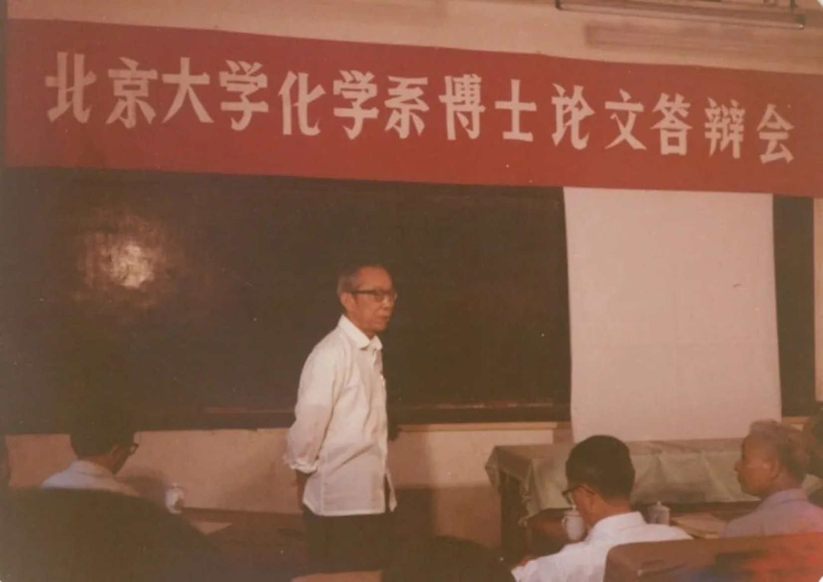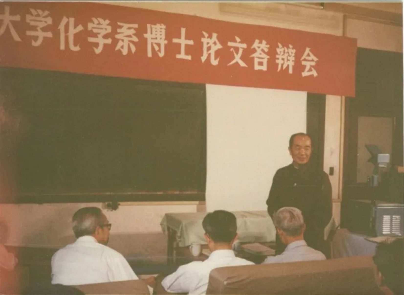 图4a. 1984年,冯新德先生(站立者)参加北京大学化学系孙燕慧的博士学位论文答辩会,介绍答辩学生情况。