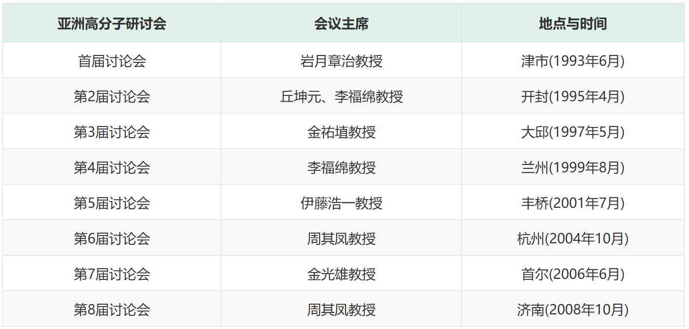 注:前两届研讨会分别又称“亚洲聚合反应讨论会”、“亚洲聚合反应与精细高分子讨论会”。