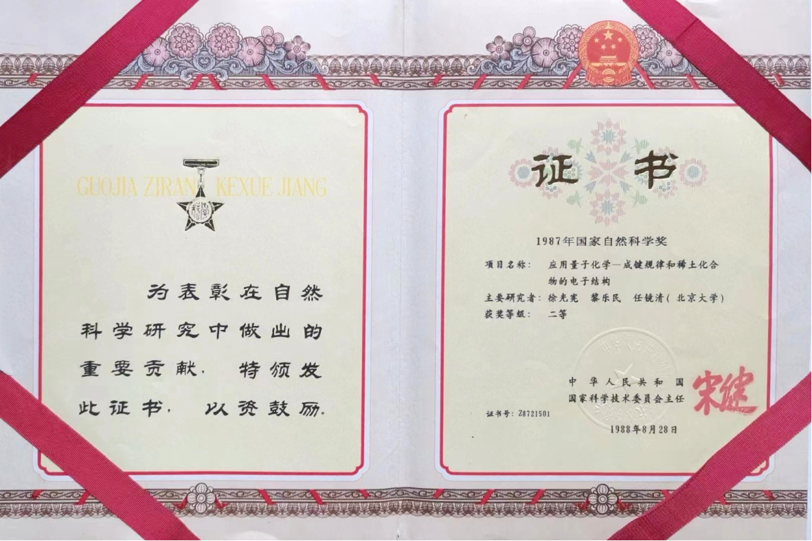 上世纪七十年代末,黎乐民先生的研究方向转向国际前沿的量子化学与理论无机化学,聚焦于稀土元素化学。他系统探索了稀土化合物的电子结构与成键规律,完成了包含4f轨道的间略微分重叠近似分子轨道理论方法(INDO方法)的公式推导与程序实现,并对国外相关理论公式进行了验证与修正。基于此,他与合作者于1982年发表了稀土化合物电子结构的系统研究,阐明了其成键特征,推动了该领域发展。他还提出了“双层点电荷配位场模型”、大体系分区计算等创新方法,并牵头研发密度泛函计算程序包,成为国内理论化学研究的重要工具。凭借在“应用量子化学-成键规律和稀土化合物的电子结构”方面的贡献,黎乐民先生于1987年获得国家自然科学奖二等奖。