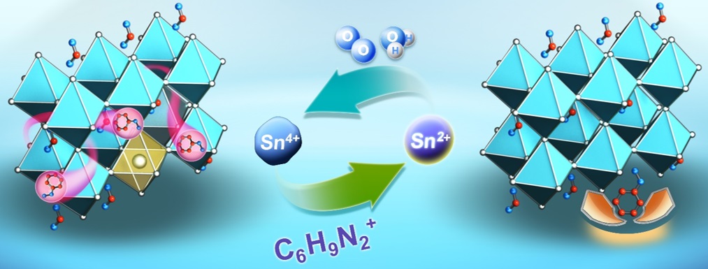 有机-无机杂化钙钛矿材料由于其优异的光电性能引起了科研工作者广泛的关注,但传统钙钛矿中Pb的毒性限制了其工业化进程,将Pb取代成环境友好的Sn元素能够有效解决这一问题。近日,本课题组在制备Sn基钙钛矿研究中取得了新的进展,通过引入具有还原性作用的盐酸苯肼(PHCl)作为自修复缺陷态钝化剂,成功制备了光电转化效率可达11.4%的Sn基钙钛矿太阳能电池。