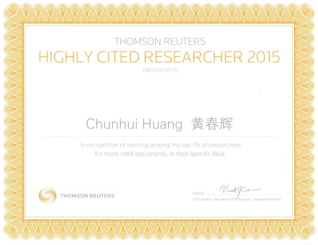 Prof. Chunhui Huang has cultivated over 40 Doctors of Science, among which 2 Doctor graduates have won the award of Top 100 National Doctoral Theses, in 1999 and 2003, respectively, and 3 young teachers have won the Chinese Chemical Society Award for Young. Since 2015, Prof. Huang has been recognized of ranking among the top 1% of researchers for most cited documents by THOMSON REUTERS.