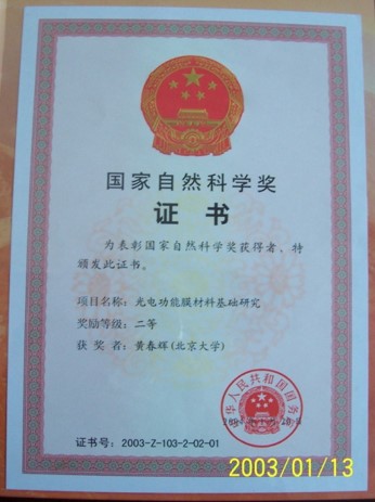 Prof. Chunhui Huang has issued Coordination Chemistry of Rare Earth (1997), Ultrathin Films for Optics and Electronics (2001) and Introduction to Organic Light-Emitting Materials and Devices (2005), and joined the composition of Series of Inorganic Chemistry Volume Seven: Scandium and Rare-earth ElementsRare-earth Elements, etc.. She has been awarded Second and Third Award of National Natural Science of China once, Second Award of Scientific and Technological Progress of National Ministry of Education twice, The Scientific and Technological Progress Award of the Ho Leung Ho Lee Foundation.
